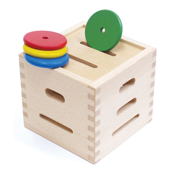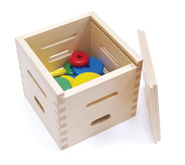 ボックスに円盤を差し込む穴があります。大きくてうすい、小さくて厚い、そしてその中間の円盤を穴の大きさを見極めて差し込みます。ひも遠しもできる優れもの。