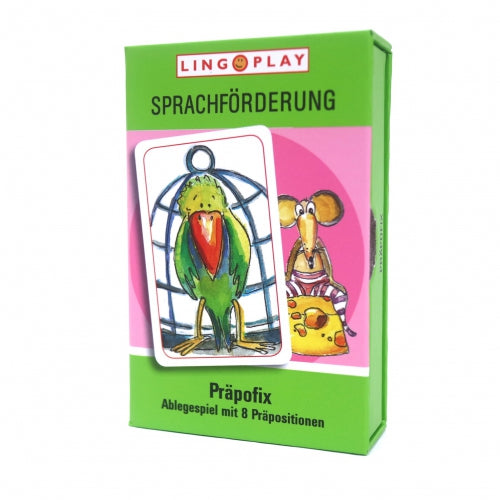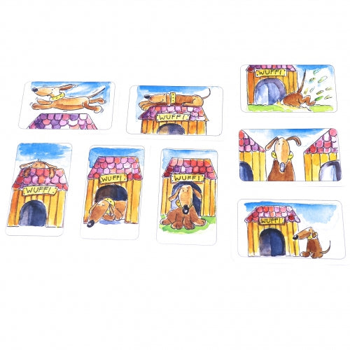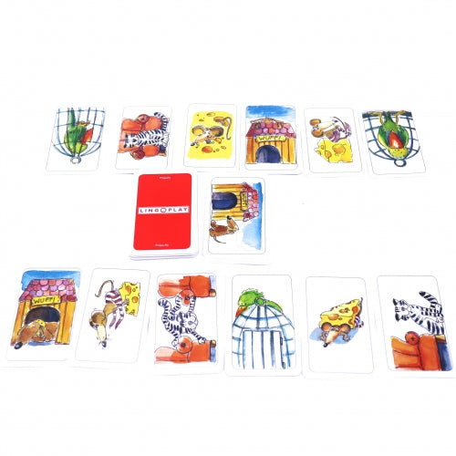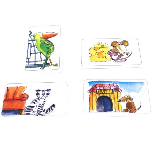 「誰がどこにいるのか」を言葉で説明しながら「誰が」または「どこに」【上・下・前・後ろ・上の方・近く(そば)・中・あいだ】のどちらかに共通点のあるカードを場のカードにつなげていきます。一番早く手持ちのカードが無くなった人が勝ちです。(輸入元カタログより引用)