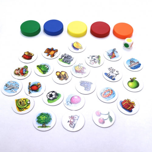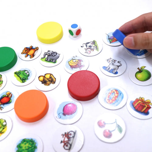 順番に色目サイコロを振って、サイコロの目と同じ色のフタの下の絵柄が何かを記憶を頼りに当てます。