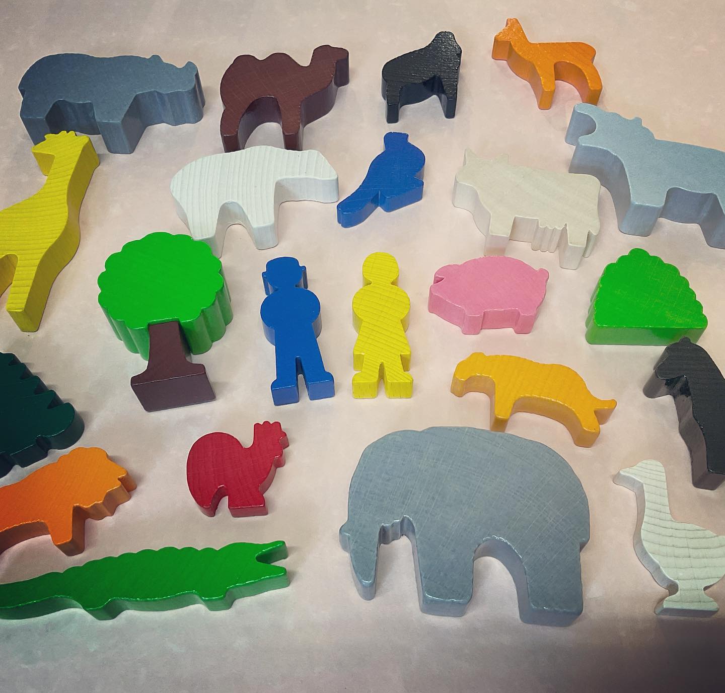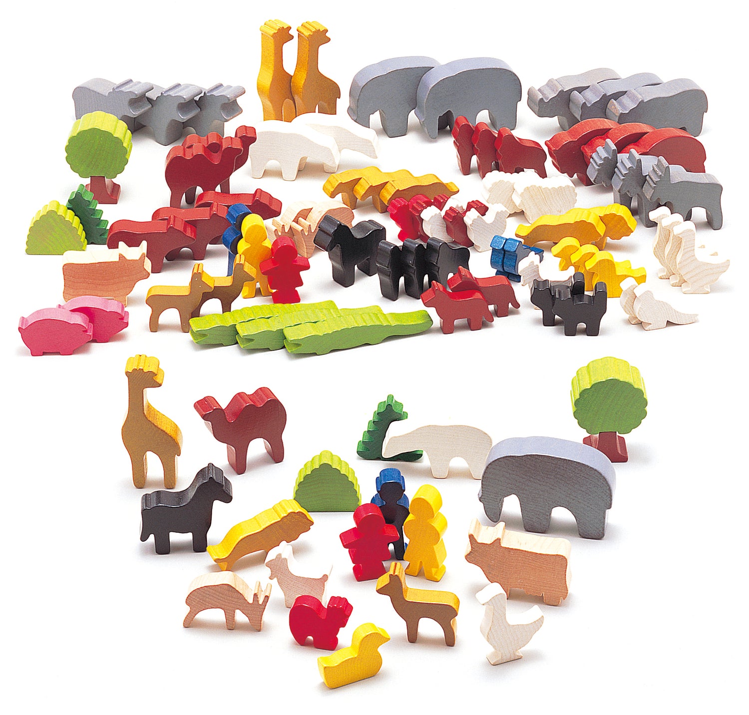 積木や汽車セットで街などを作ると、そこに人形や動物を並べてお話を広げていきたいものです。この動物はわりと大きく小さい子でも遊びやすくなっています。92個入り。