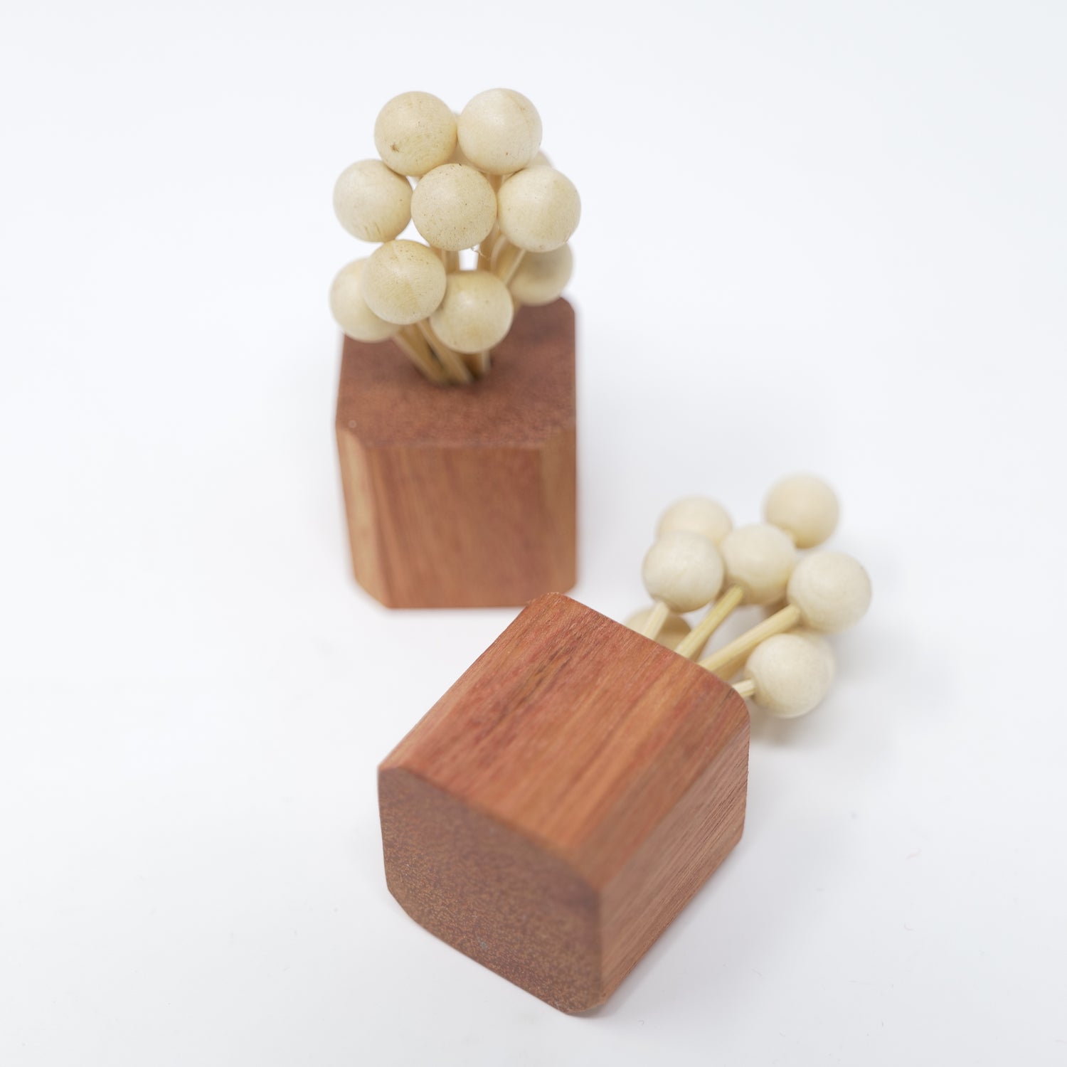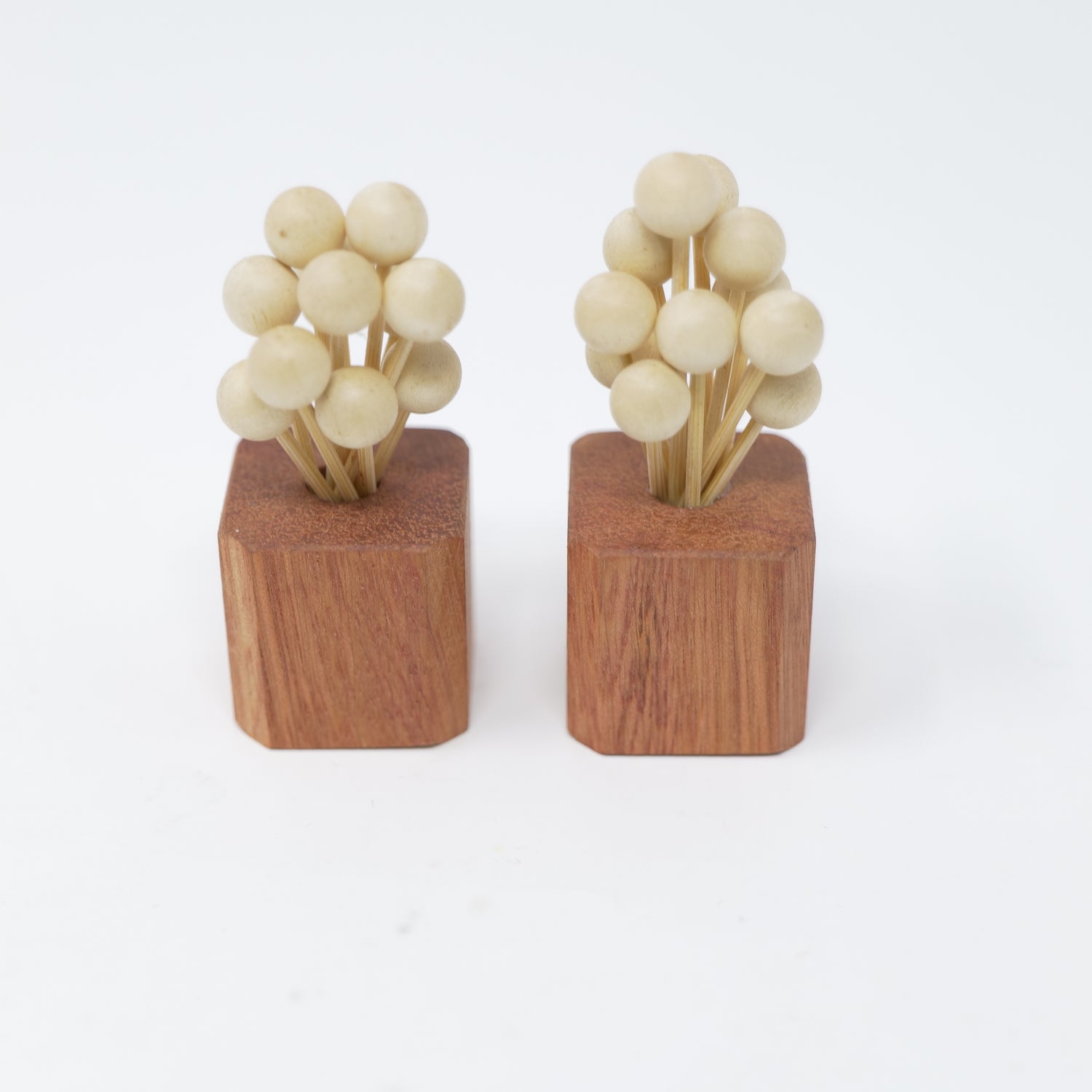 こちらのひな一段セットは2025年発売の限定モデルです。木が本来持つ色をそのまま生かしています。人形本体はコクタン・ヒバ・カリン、ぼんぼりはカリン・カラ松・コクタン、花はミヅキ・竹・カリン、ひな台はウォルナットが使われています。