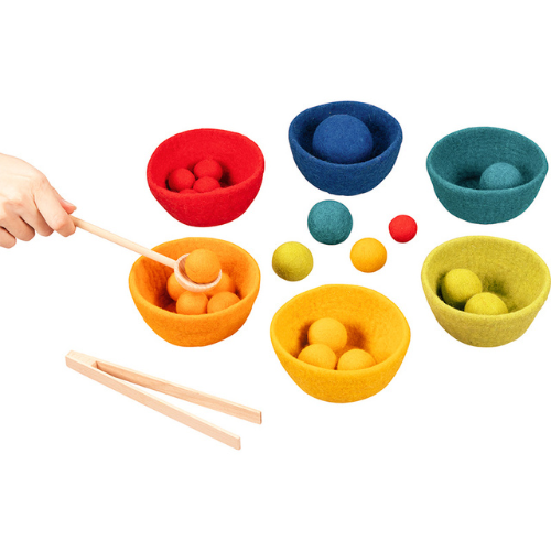 羊毛100%のフェルト生地のボウル(容れ物)と大きさの異なるボール(球体)のセットです。スプーンやトングを使って、入れたり出したり、自由に楽しめます。