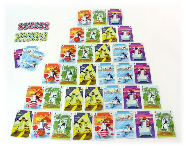 ペンギンカードには緑・黄・赤・紫・青の5色があります。カードは全部で36枚(緑だけ1枚多い)あって、それらを遊ぶ人数で均等に分けます。