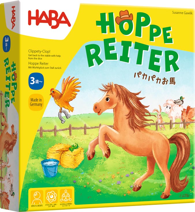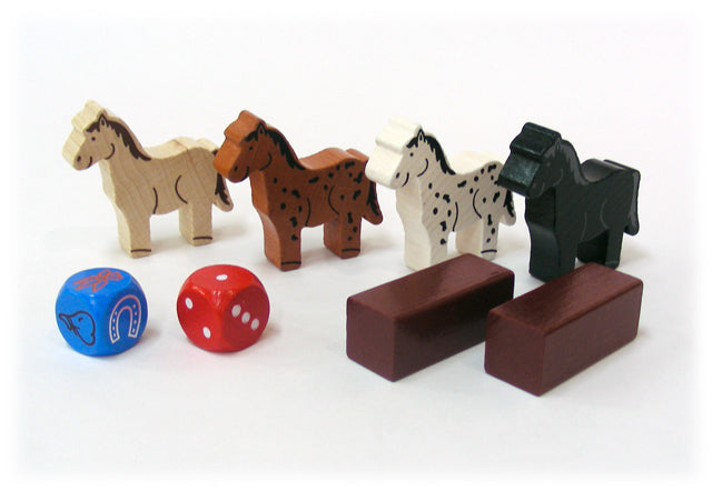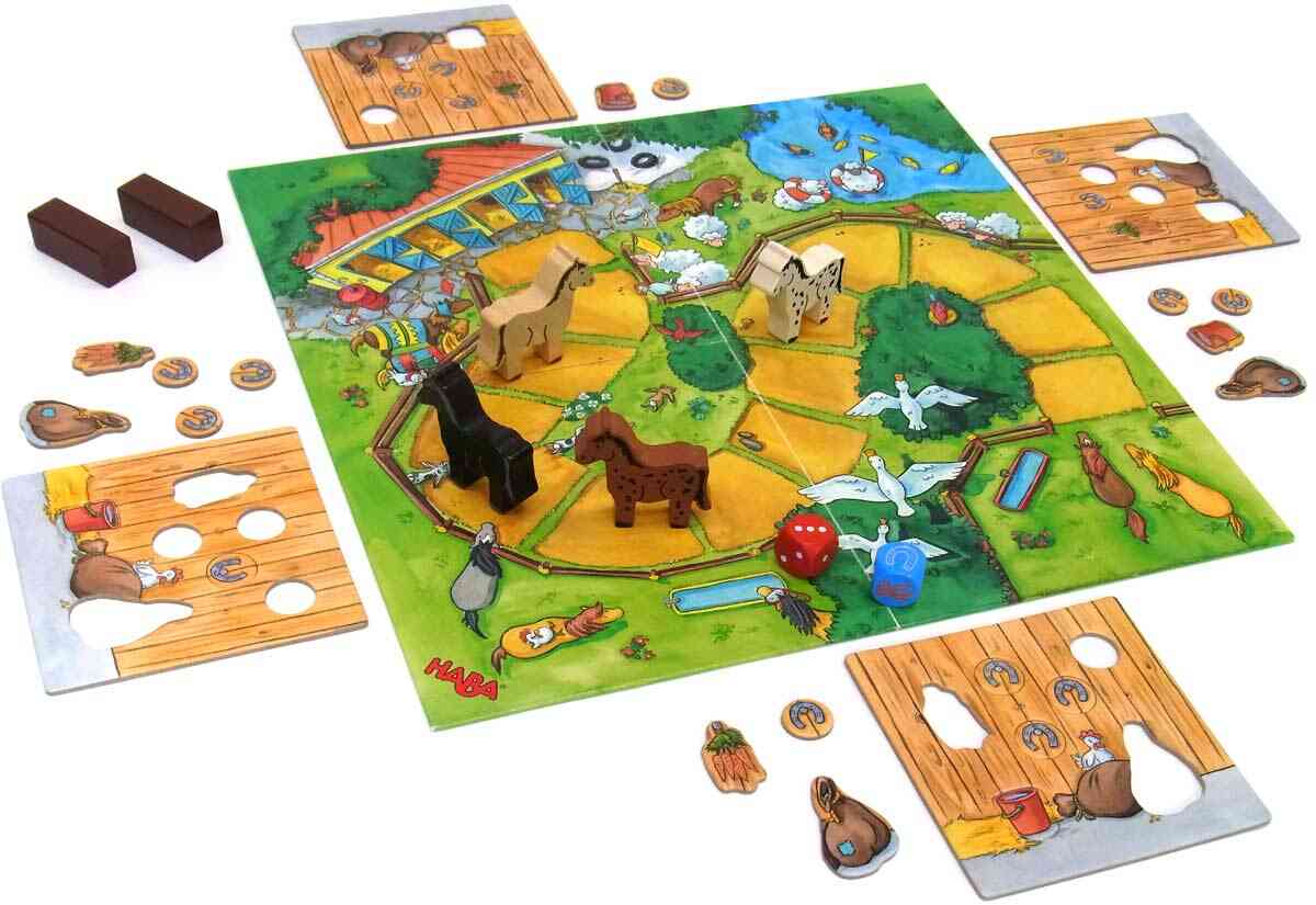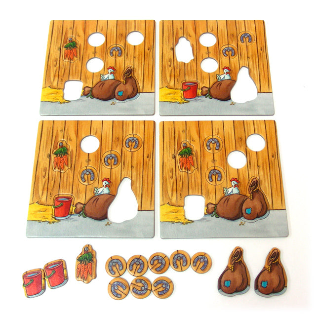 いち早く馬小屋にゴールすることを目指すすごろくゲーム。ただし、各プレイヤーに与えられたパズルボードの空いたところにある道具を7枚すべて集め、ボードを完成させなければゴール出来ません。