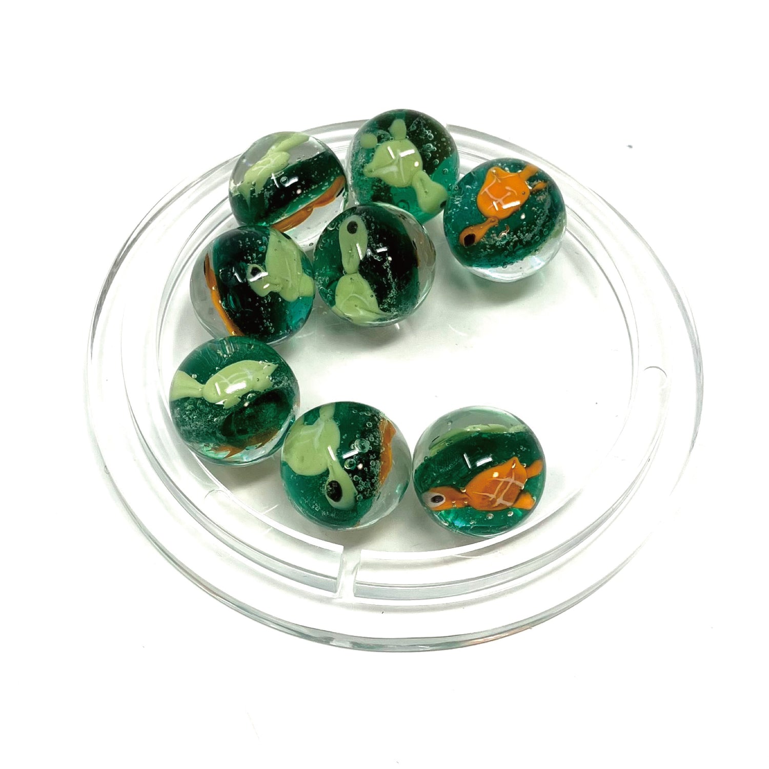 ※ ビー玉は同じ種類のものでも個々に違っているため、例としていくつか並べて写真を掲載しています。ご参考になさってください。こちらは2枚目の写真の通り、表面と裏面にそれぞれ緑とオレンジのかめがデザインされています。