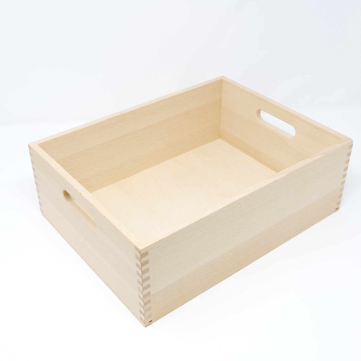 内寸の幅と長さが変わらず、もう少し浅い(75mm)「積み木 木箱 単品 中」もございます。